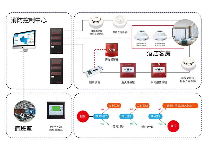 2.套房一般要設置多個帶蜂鳴器的探測器,酒店方面一般需要解決套房內(nèi)多個蜂鳴器底座的同步鳴響問題。保得威爾完全可以滿足要求。