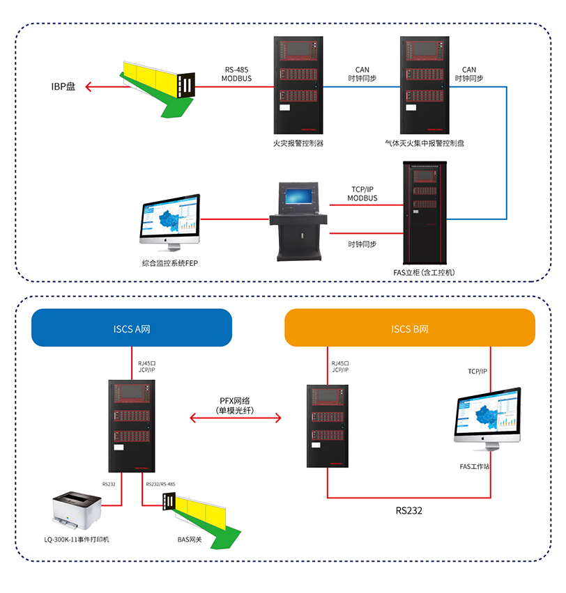 解決方案B:FAS系統(tǒng)接口:與ISCS的接口,通過火災(zāi)報(bào)警控制的專員網(wǎng)關(guān)提供的Mod-busTCPIP協(xié)議分別與ISCSA網(wǎng)和B網(wǎng)連接組成冗余網(wǎng)絡(luò),與BAS的接口,可采用FACP盤上的RS485接口,傳輸標(biāo)準(zhǔn)ModbusRTU協(xié)議的火災(zāi)報(bào)警模式指令,可向BAS傳輸99種火災(zāi)報(bào)警模式信息。